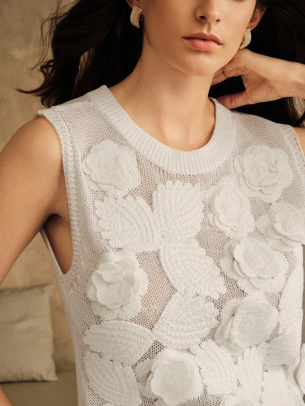 ミラドール ベージュ 中空 3Dクロシェ 半袖 エレガントで独特のゴージャスなニットトップ レディース、秋、夏、エレガント、シック、新年、カジュアルに適しています