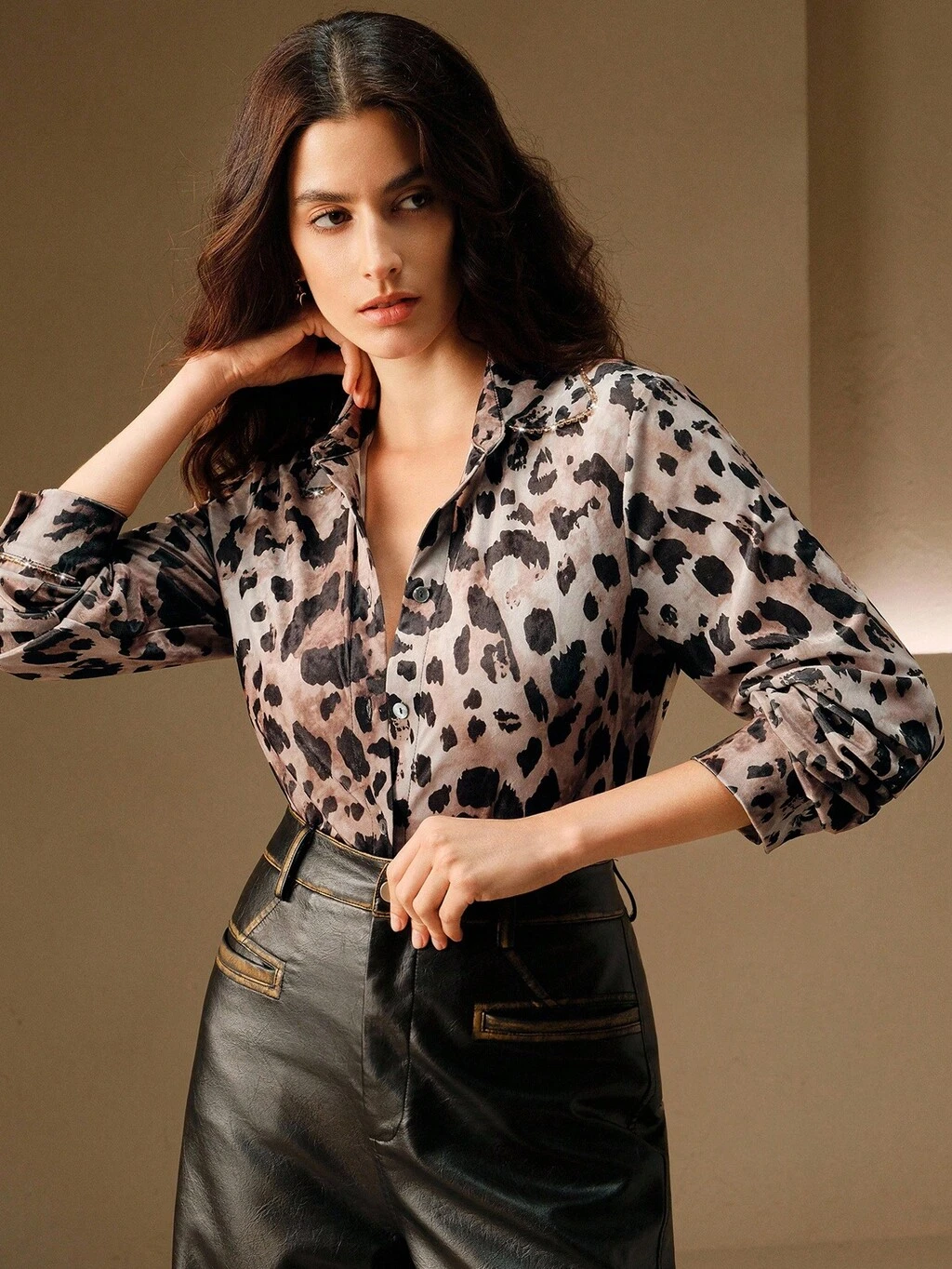 Vintage Elegant Ombre Leopard Print Stand Collar Long Sleeve Women Shirt, Suitable For Fall/Winter, Christmas, New Year, Elegant, Luxury, Chic, Casual