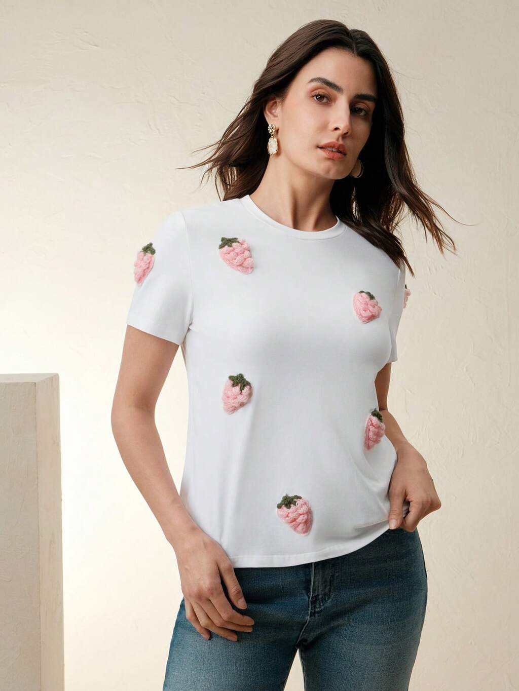 Women's Slanted Shoulder Short Sleeve T-Shirt, 3D Strawberry Print Slim Fit For Summer