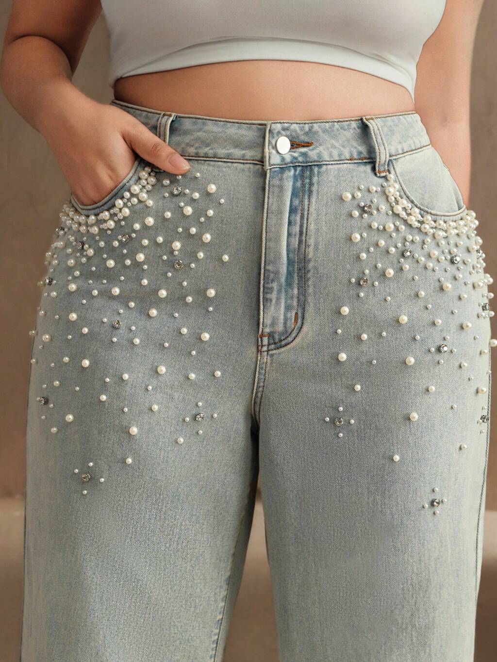 Plus Size Women Beaded Loose Pocket Wide Leg Jeans