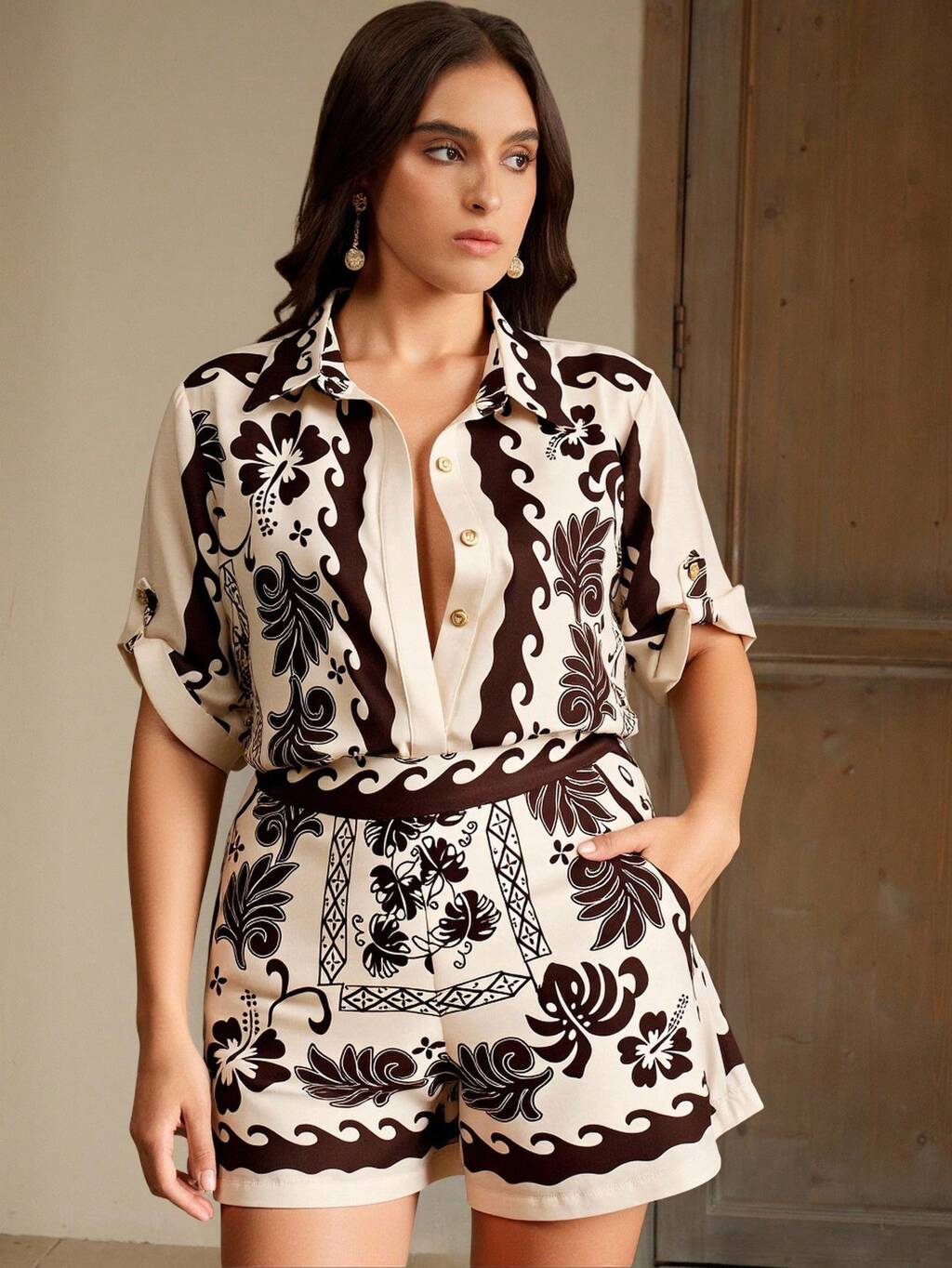 Women's Elegant Floral Embroidered Collared Long Sleeve Pocket Blouse, Brown