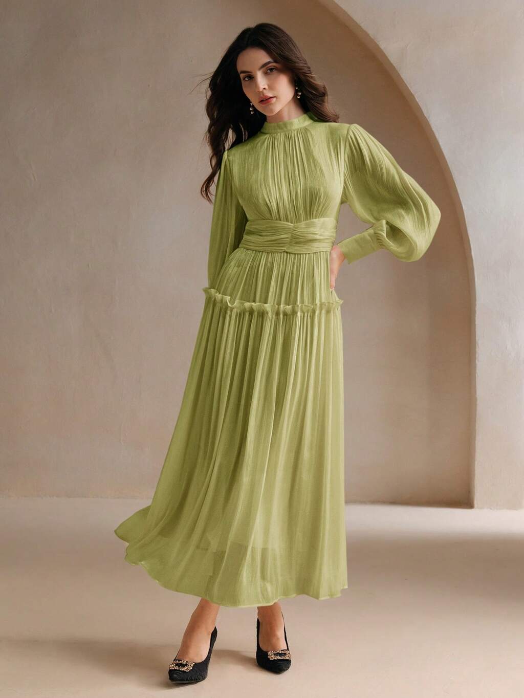 Distinctive Sparkly Fabric Puff Sleeve Waist-Tie Maxi High Waist Dress