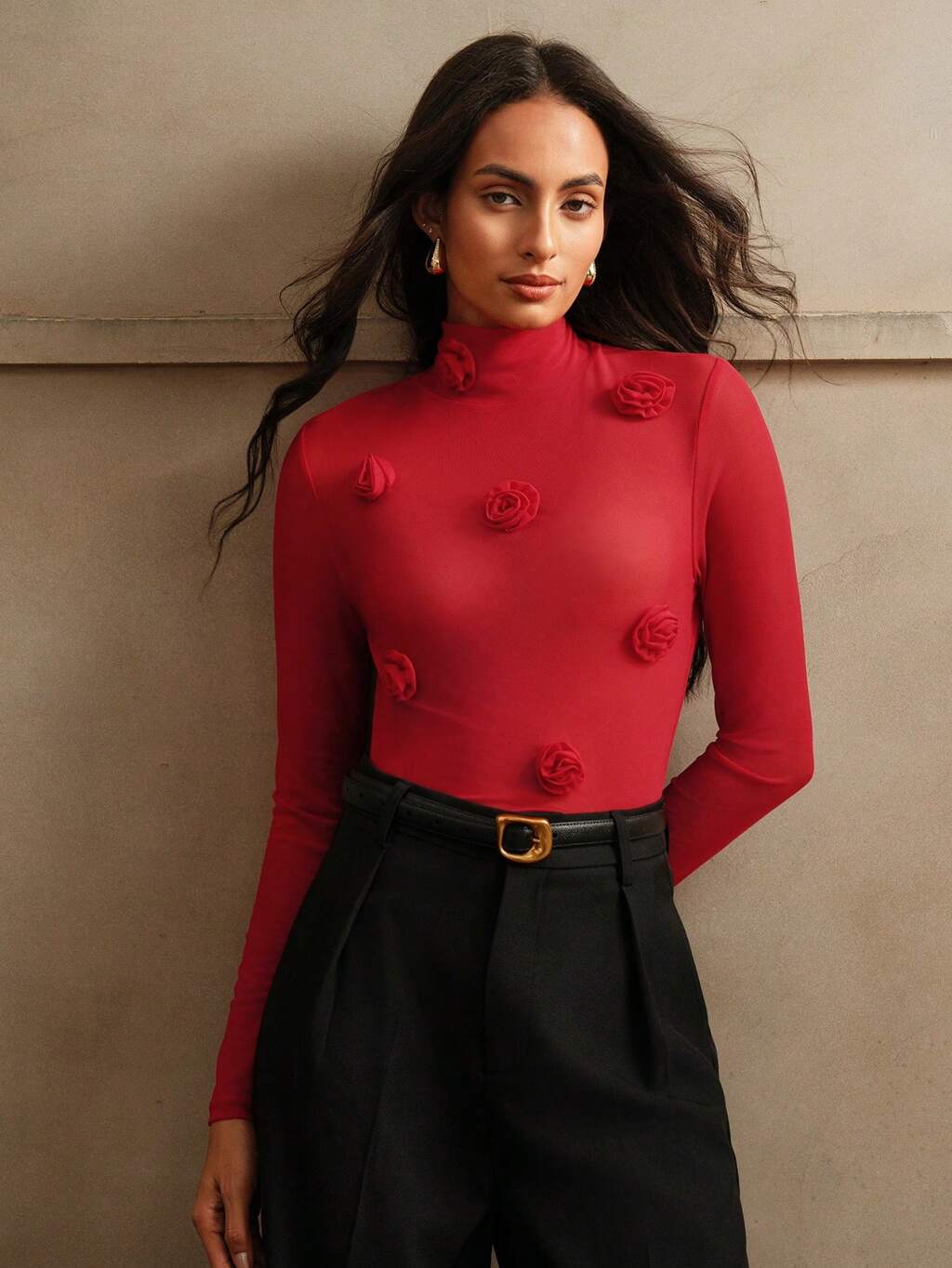 Elegant 3D Floral Stretch Knit Base Blouse For Women, Autumn/Winter