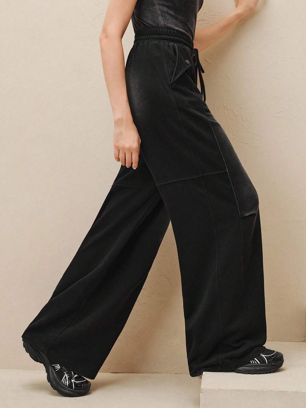 レディース オータム サンドウォッシュ ドローストリング カジュアル ルーズ ストレートレッグ ブラック スウェットパンツ