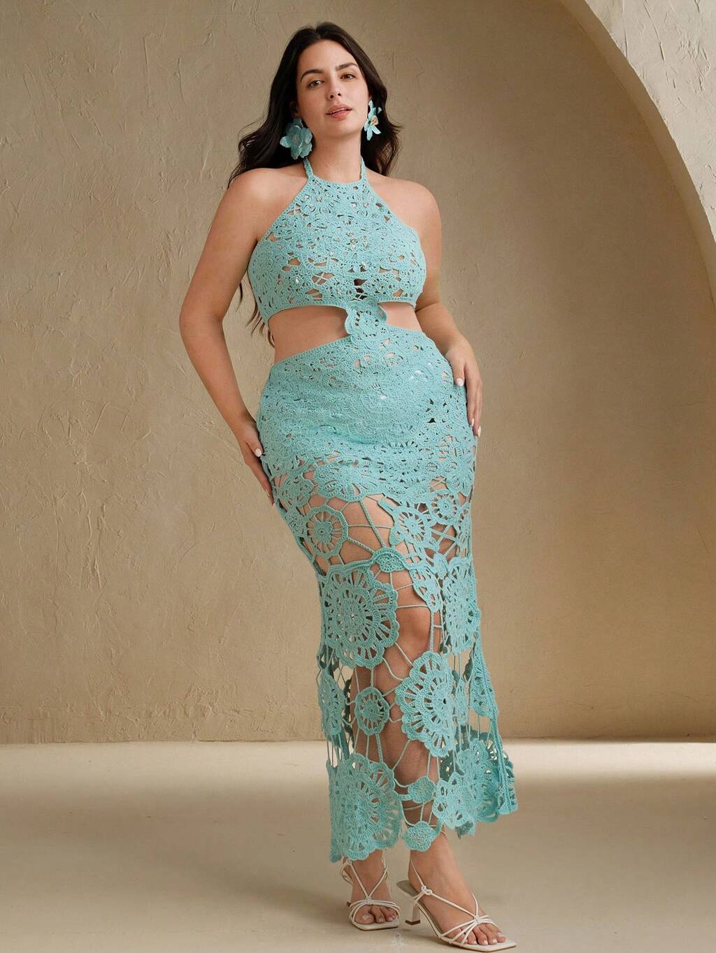Plus Size Women Crochet Floral One Shoulder Romantic Vacation Coverup Dress For Summer