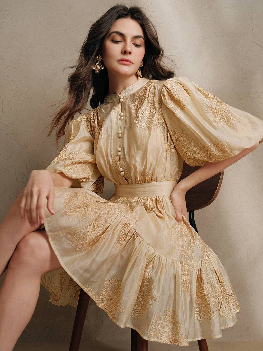 Vestido mini de cuello cuadrado con adorno floral dorado
