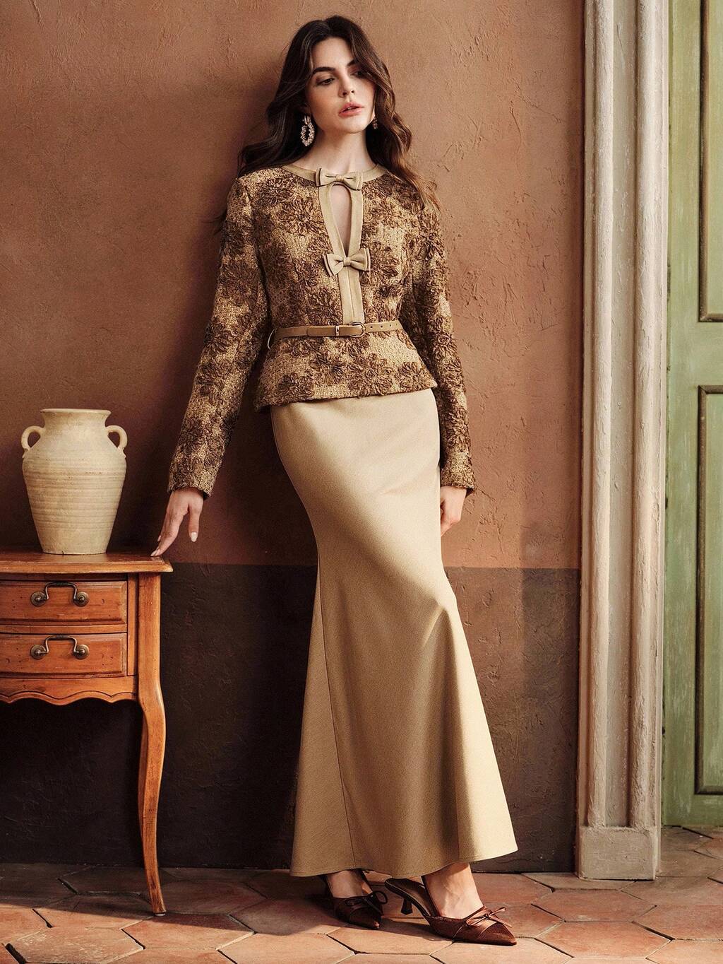 2pcs Elegant Ruffle Embroidered Floral Print Long Sleeve Mandarin Collar Blouse And Flared Midi Skirt Set For Women