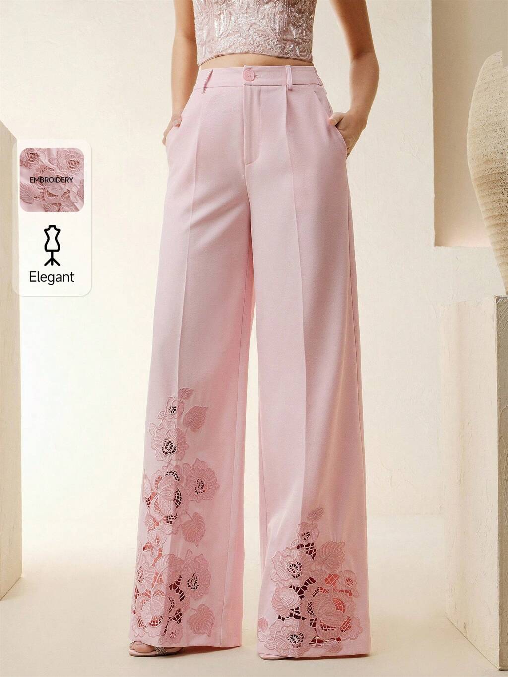 Women's Heavy Embroidered Hollow Flower Pink Loose Pants, Summer
