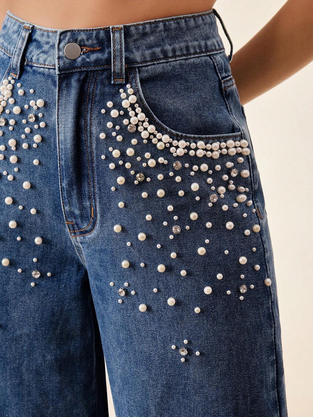 Vintage Rhinestone & Beaded Embellished Straight Leg Jeans For Women, Casual & Elegant