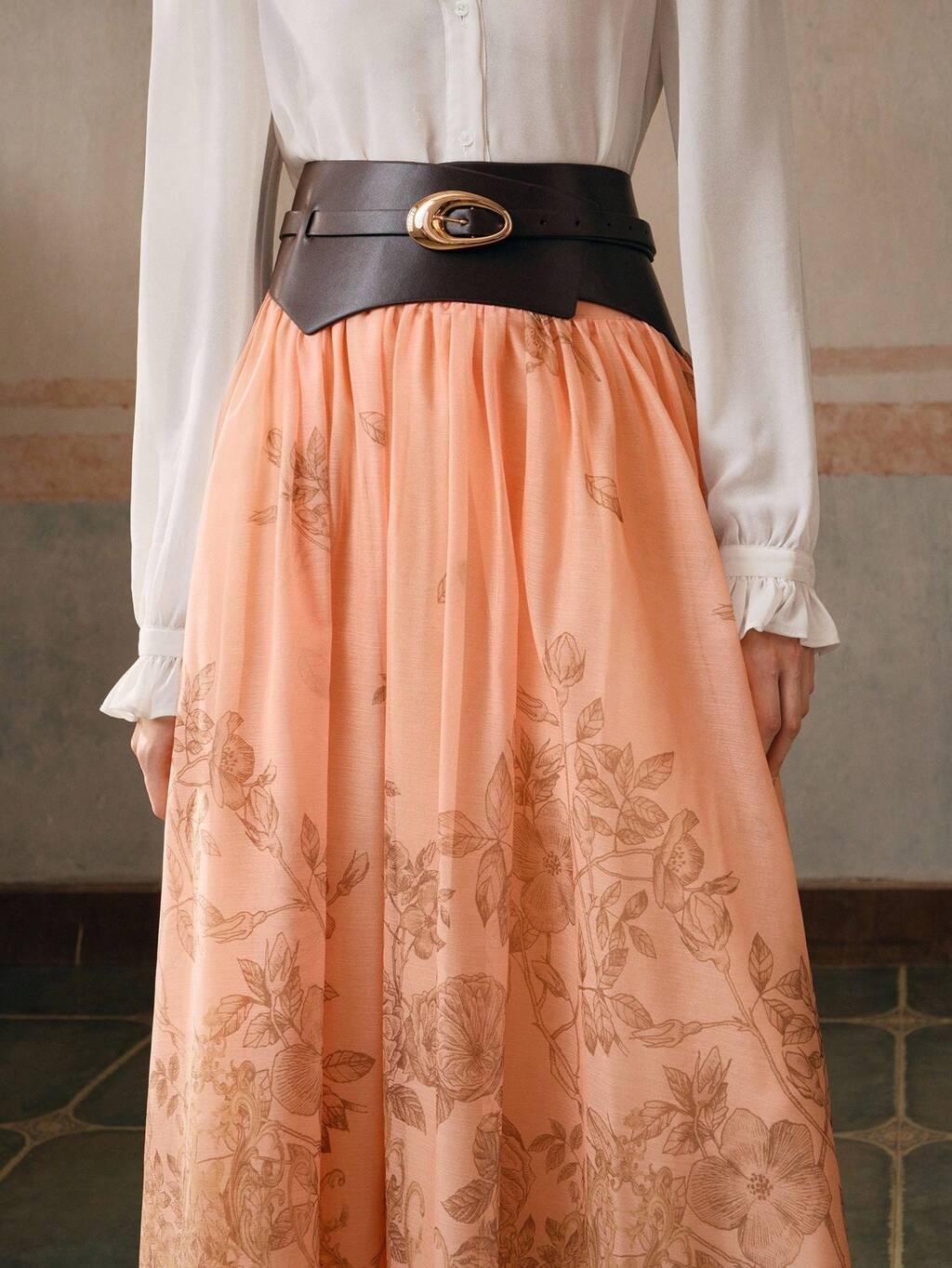 Elegant Women's Apricot Color Pleated Flared Floral Print Skirt, Suitable For Spring, Summer, Business Casual, Graduation