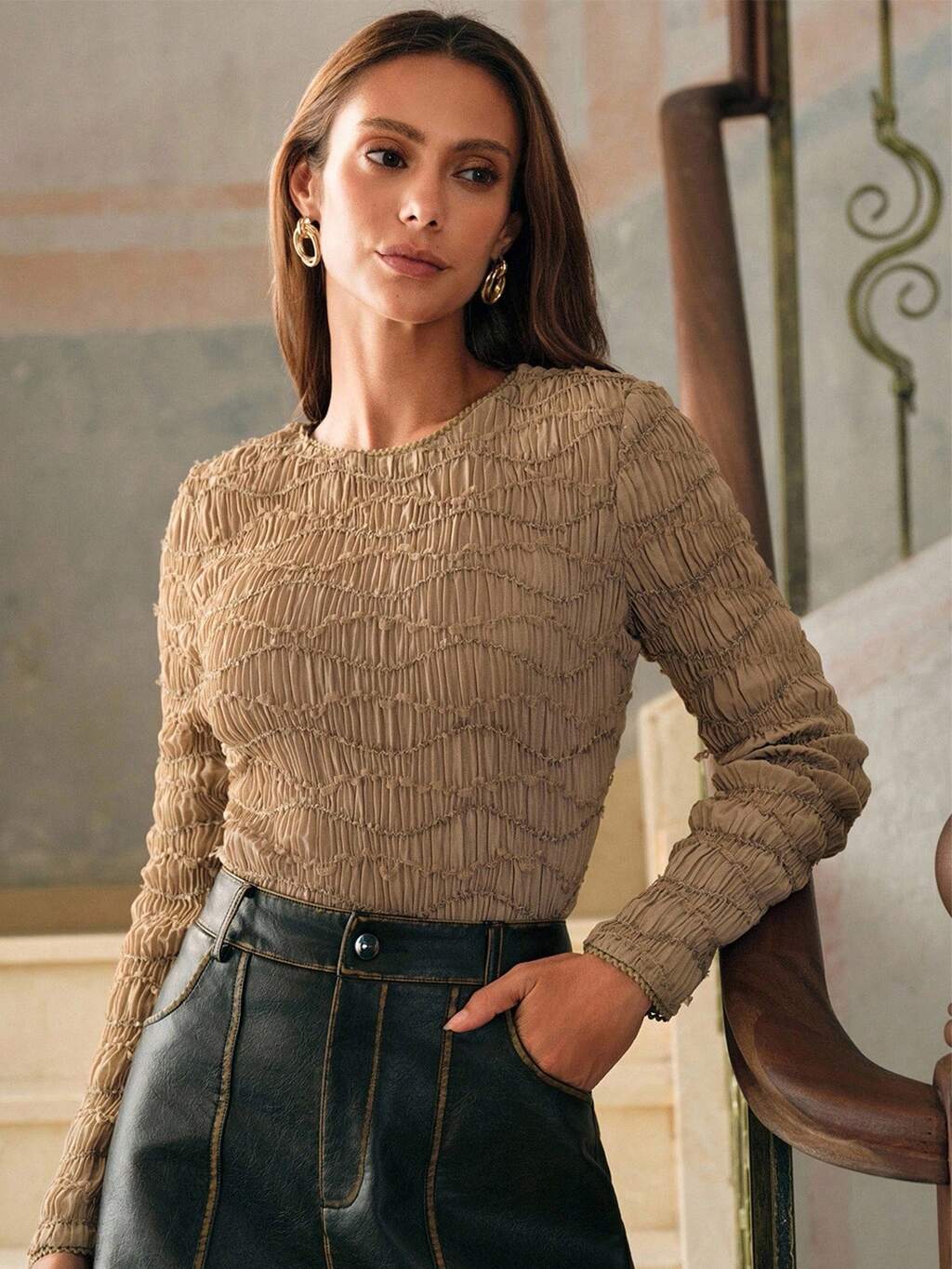 Women's Fashionable Casual Long Sleeve Top With Vintage Coin Pattern, Handmade Beaded Embroidery