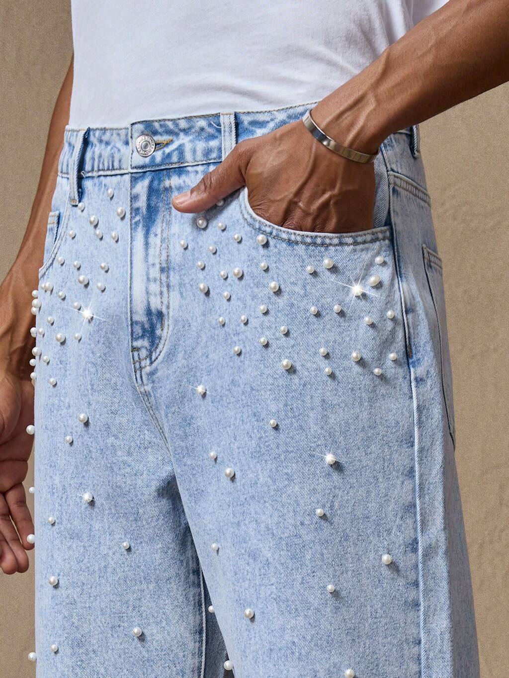 Men's Light Blue Denim Pearl Decorated Casual Straight-Leg Jeans, Suitable For Summer, Vacation, Daily Wear, Parties, Couple Sets, Father's Day Gift, For Rave