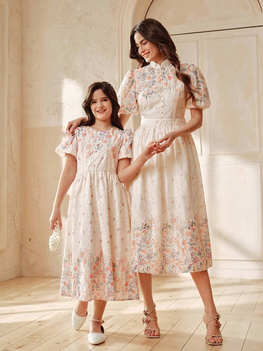 Fashionable Printed Short Sleeve Dress With Button Decor For Tween GirlsElegant Party Outfit For Pre-Teens Tween Modest Dresses Teen Girl Spring Dress Puff Sleeves Matching Outfits Midi Mother Daughter