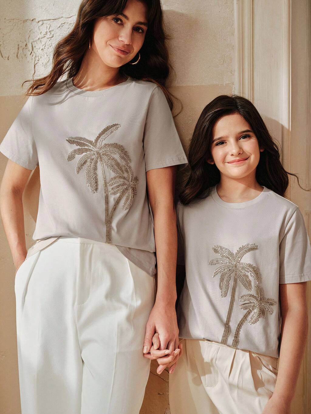 Girls' Khaki T-Shirt With Beaded Coconut Tree Embroidery, Summer