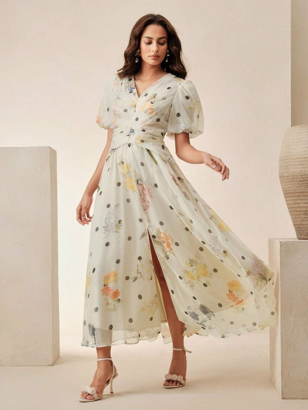 ポルカドットのしわのあるスリムなロングドレス レディース エレガント
