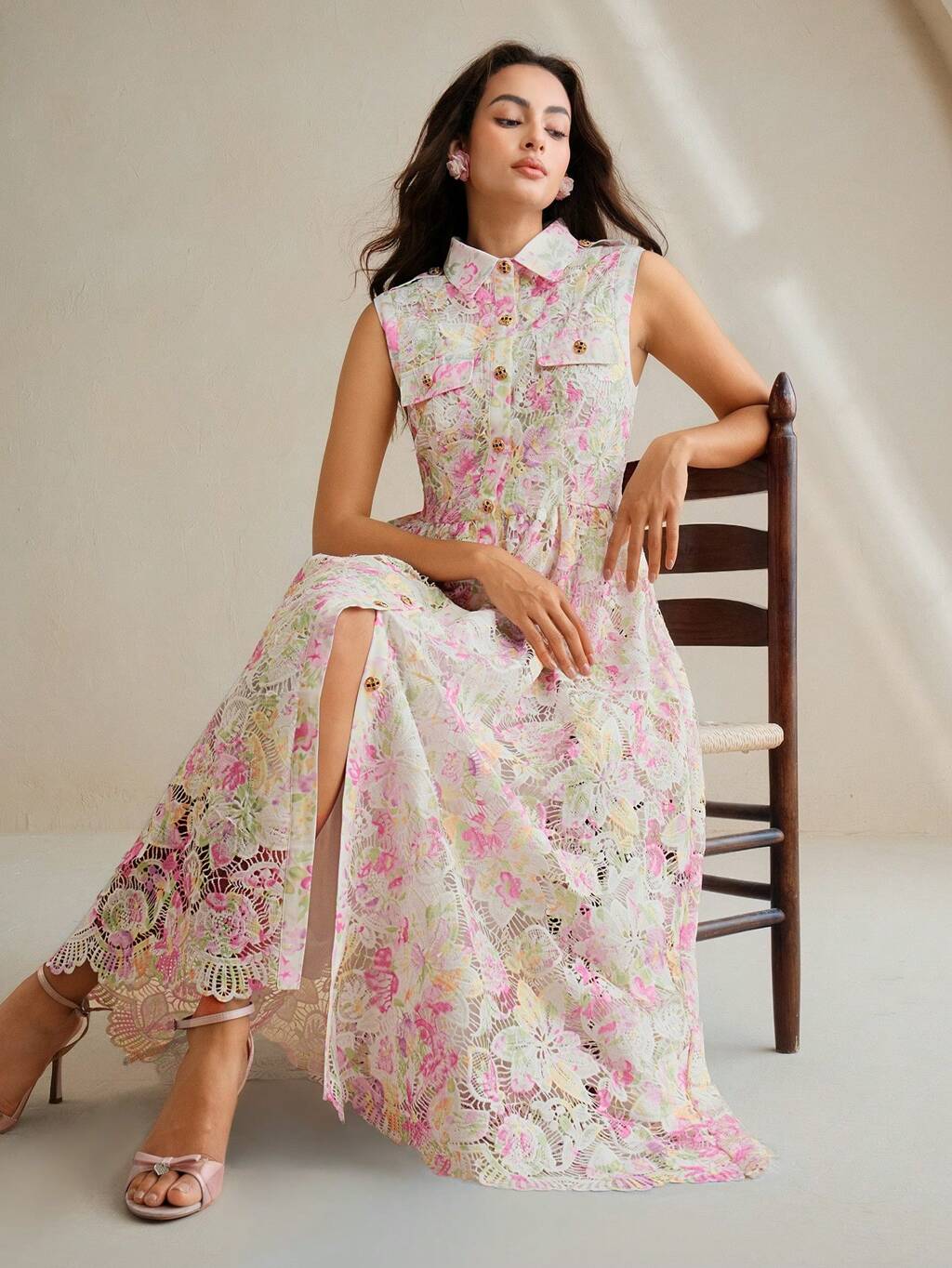 Elegante vestido sin mangas con estampado floral de encaje hidrosoluble, solapa clásica, cierre simple y cinturón en la cintura, para mujer, primavera/verano