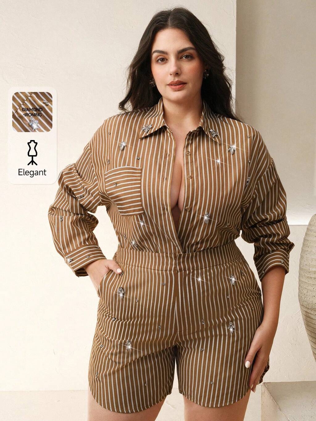 Plus Size Women Striped Shirt With Handmade Rhinestone Decor, Versatile For Commuting And Daily Wear