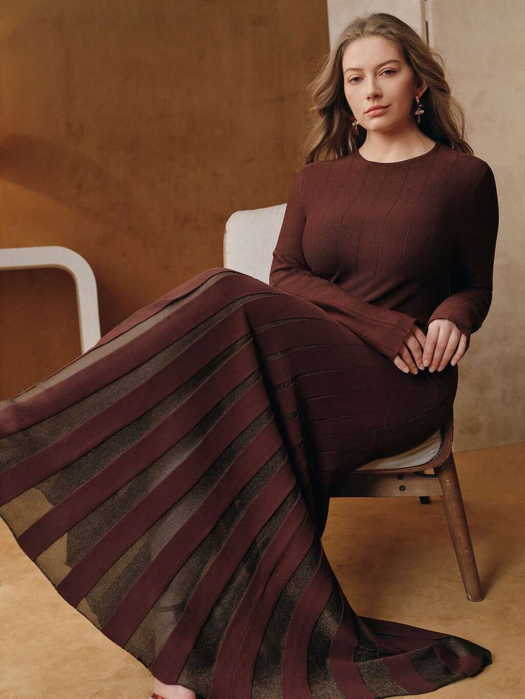Plus Size Women's Autumn/Winter New Red-Brown Round Neck Fitted Bodycon Maxi Fish Tail Dress, Suitable For Christmas And New Year