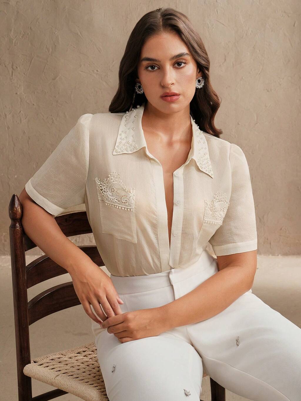 Plus Size Women Beaded Collar Lace Trim See-Through Short Sleeve Blouse