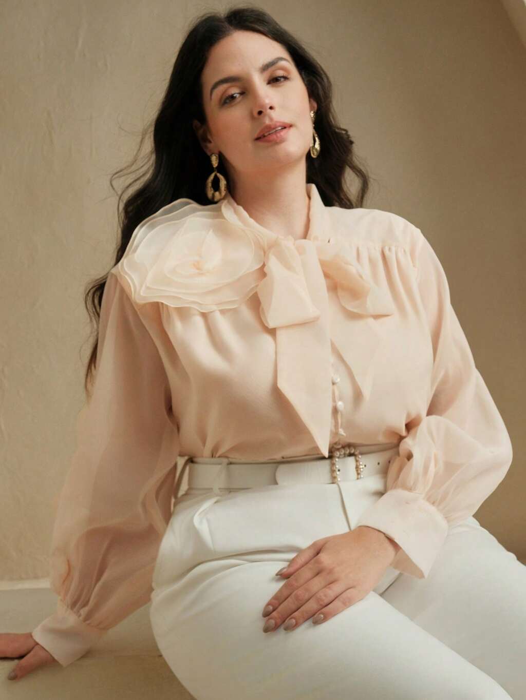 Elegant Loose Solid Color Chiffon Floral Tie-Up Decor Oversize Women Long Sleeve Shirt, Spring/Summer
