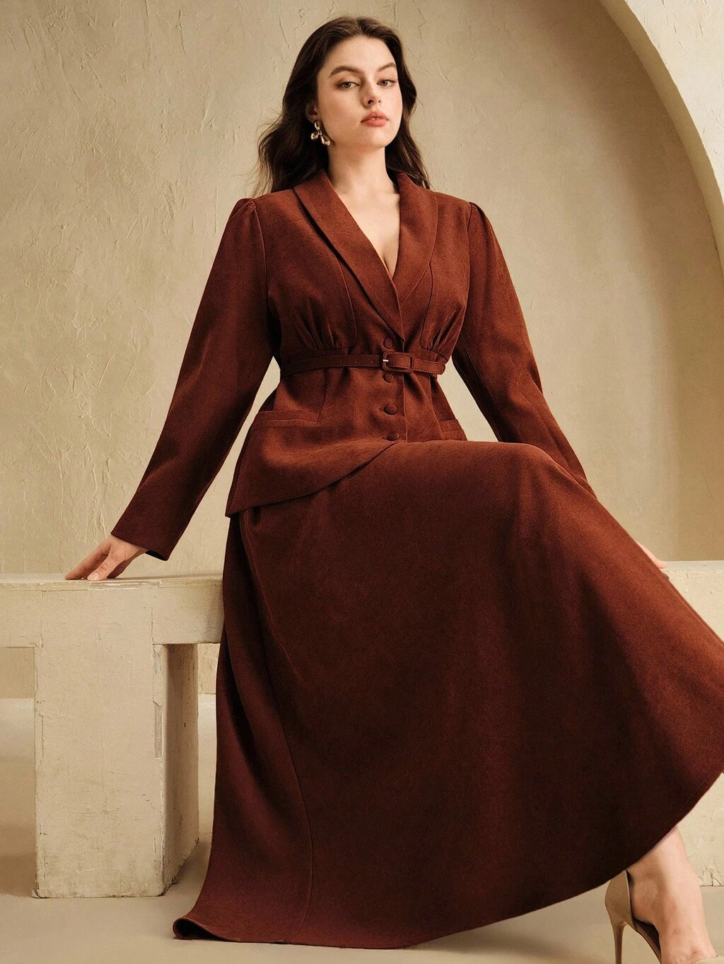 Plus Size Women's Elegant Two Pieces Set: Cinched Waist Blazer Jacket + Skirt, Suitable For Commuting, Winter, New Year, Fall, Winter, New Year, Party, Wedding, Elegant, Chic, Stylish, Casual, Christmas, Formal, Business Casual
