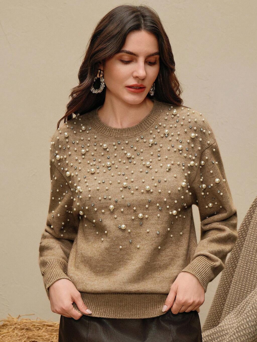 Anewsta Camel Crew Neck Long Sleeve Asymmetric Pearl Knit Sweater For Women, Suitable For Autumn/Winter, Christmas, Lunar New Year, Parties, Elegant, Luxury, Formal, Fashion, Business, Graduation