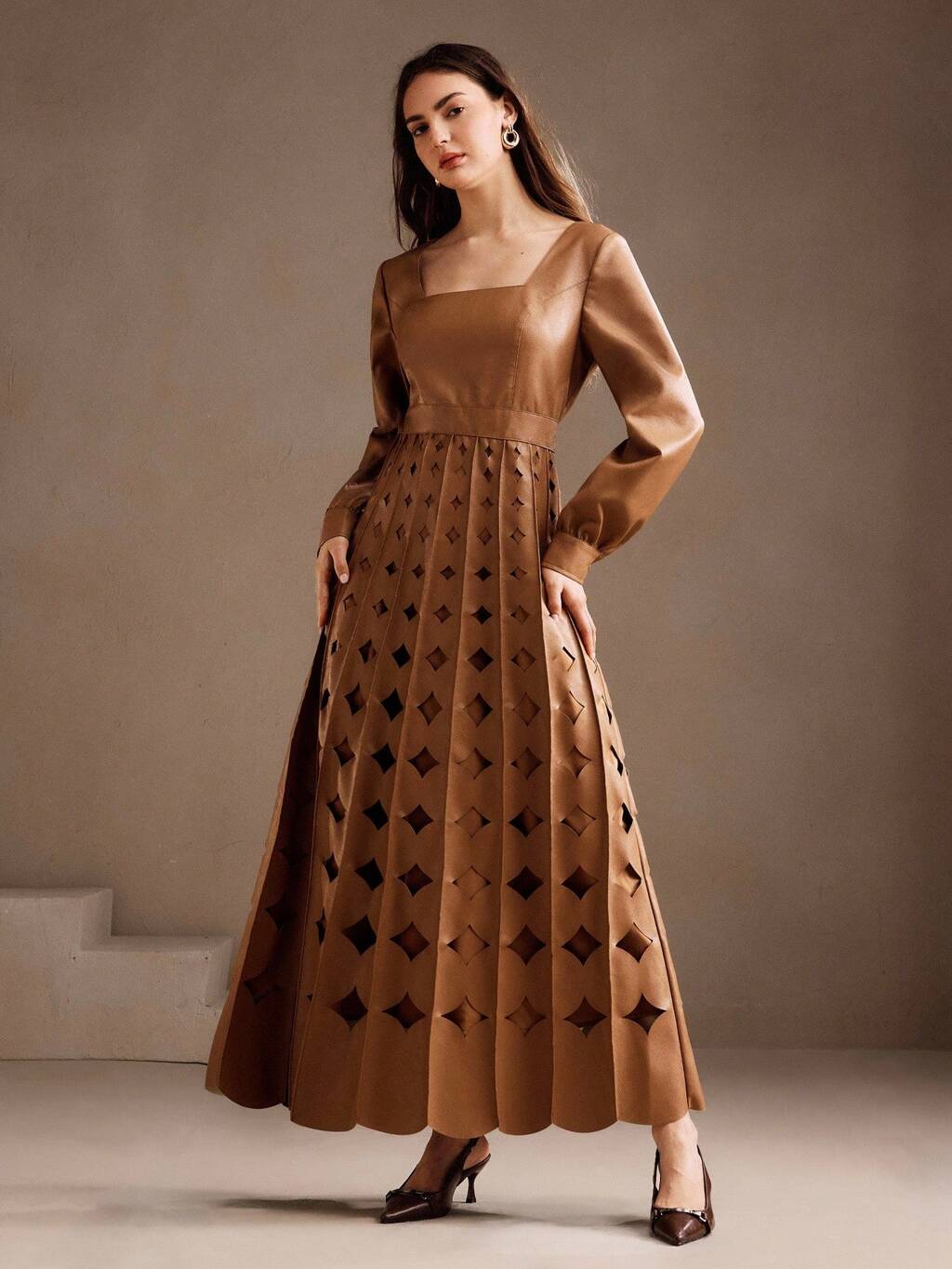Women's Khaki Leather Patchwork PU Laser Cut Hollow Floral Long Dress, Elegant & Dignified, Autumn/Winter