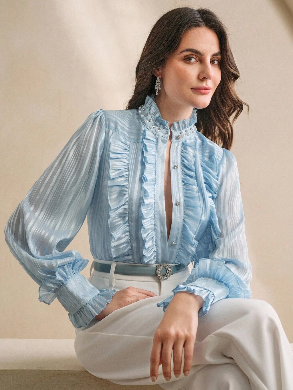Women's Elegant Ruffle Beaded Long Sleeve Blouse