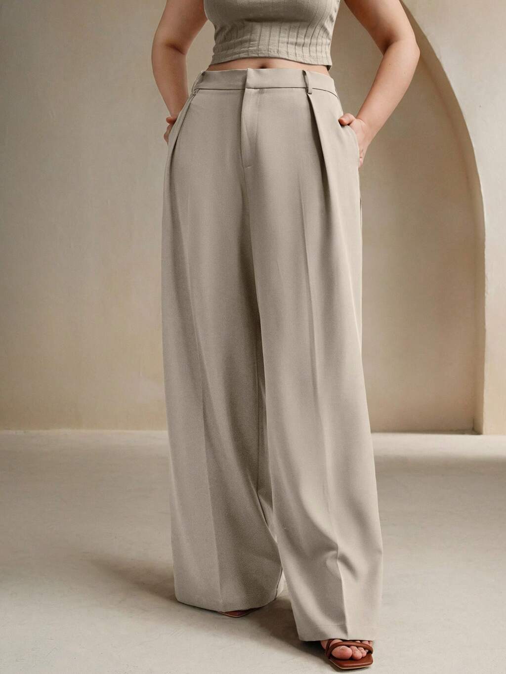 Beige Plus Size Elegant & Fashionable Business Casual Ladies Trousers