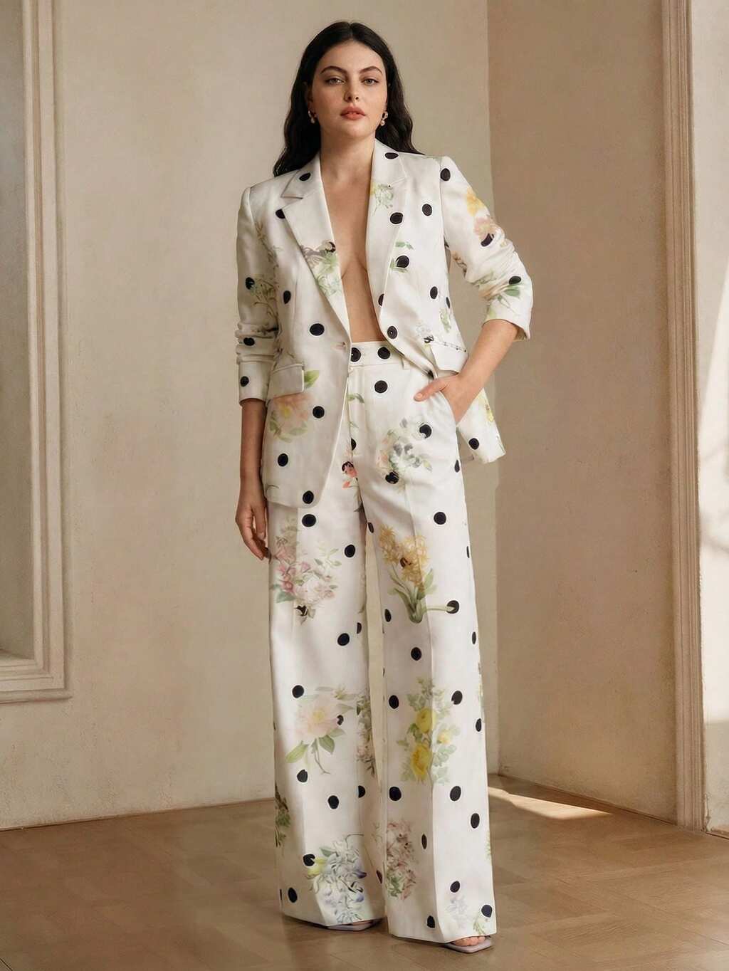 Women's Fashionable High-End Polka Dot & Floral Cinched Waist Plus Size Blazer, Suitable For Going Out, Party, Formal Occasions