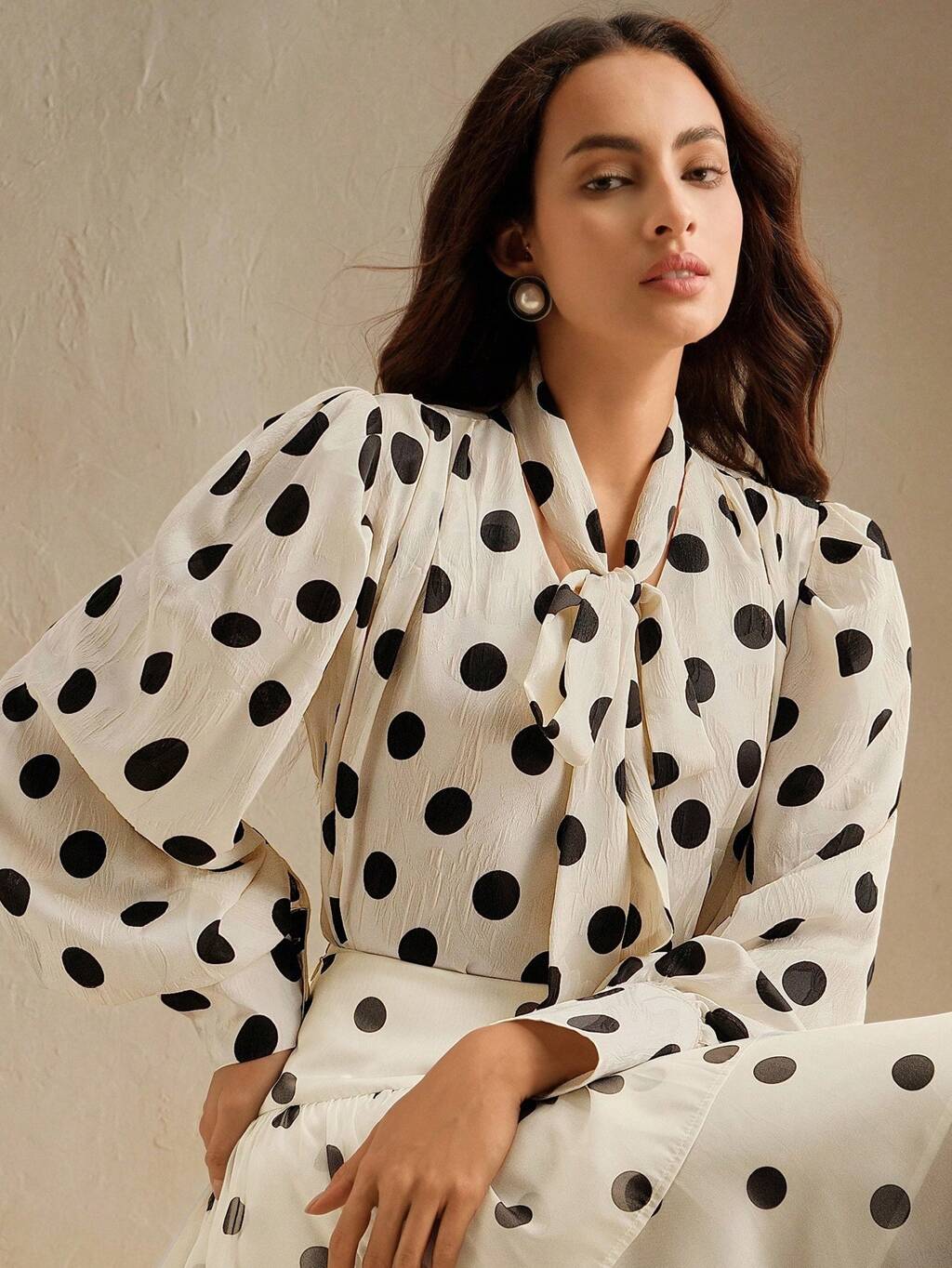 Anewsta Elaire Summer Elegant Fashionable Commuting Casual Polka Dot Bow Design Women Shirt