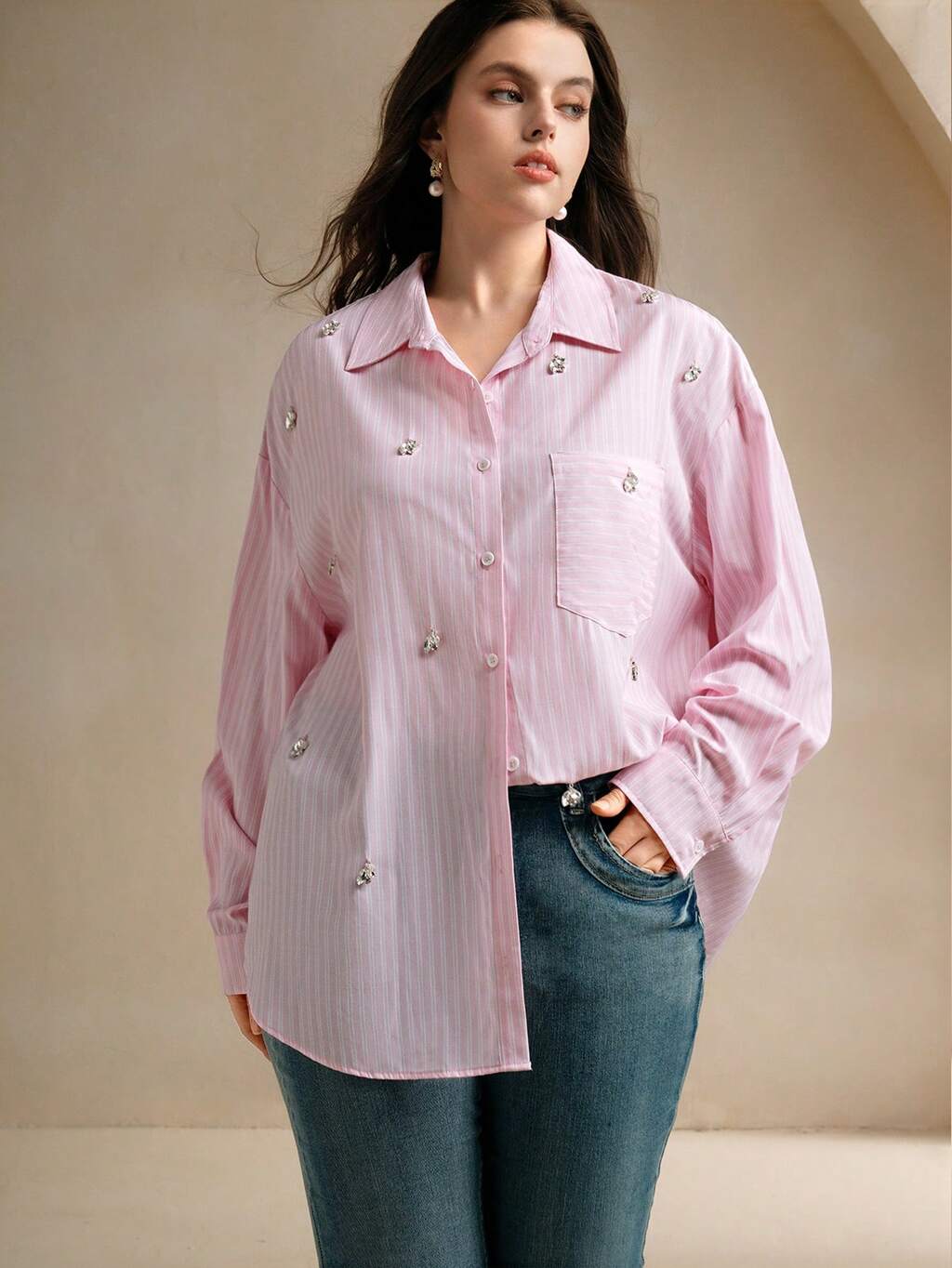 1pc Plus Size Women French Design Elegant Casual Fashionable Pink Striped Handmade Crystal Embellished Blouse Women Shirt