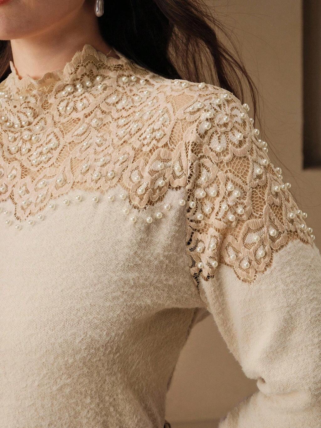Lace Patchwork Beaded Long Sleeve Plus Size Women T-Shirt, Elegant, Chic, Stylish For Fall, Winter, New Year, Christmas, Going Out