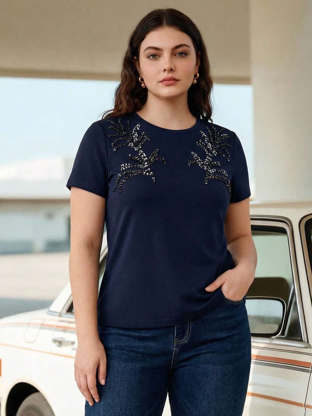 Plus Size Women's Elegant Sequin Embroidered Short Sleeve T-Shirt, Casual Office Lady Fitted Knit Crew Neck Top, Navy Blue