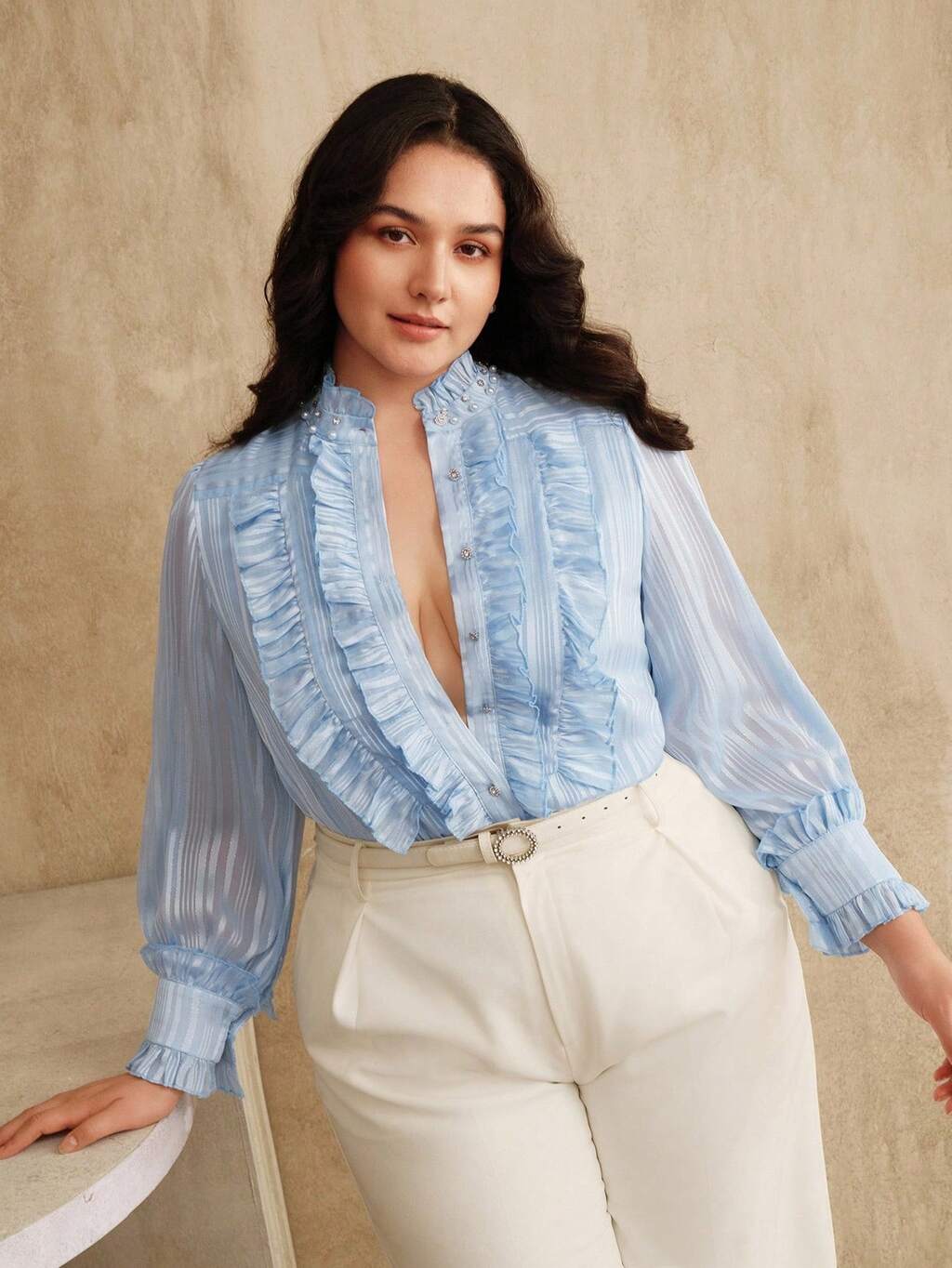 Plus Size Women's Elegant Ruffle Beaded Long Sleeve Blouse