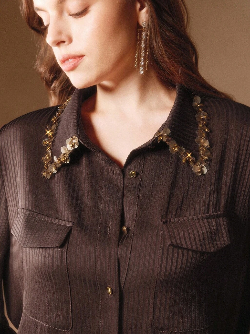 Women's Plus Size Elegant Brown Shirt, Classic Open Collar Long Sleeve Loose Fit, Featuring Jacquard Textured Fabric And Handcrafted Pearl Embellishments, Suitable For Everyday And Occasion Wear, Autumn/Winter