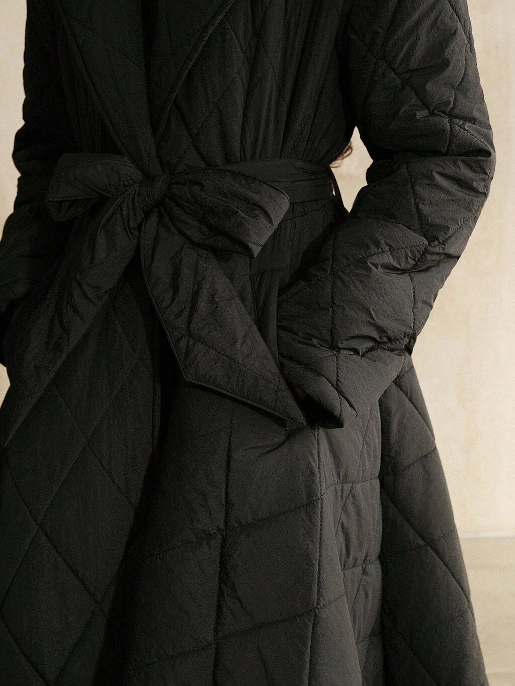 Fall & Winter Women's Clothing Wear Elegant, Simple, Fashionable Modern Lapel Rhombus Plaid Quilting Plaid Straps Long Sleeves Solid Color Black Large A-Line Warm Women Long Cotton Coats Autumn,Fall,Winter,Going Out,Elegant,Formal,Party,Chic,New Year,Women's Winter Coat,Christmas,Work,Graduation,Wedding