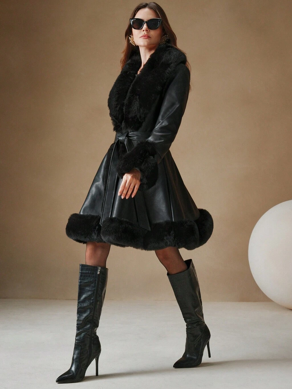 Oversized Fuzzy Collar Long Coat With Belt