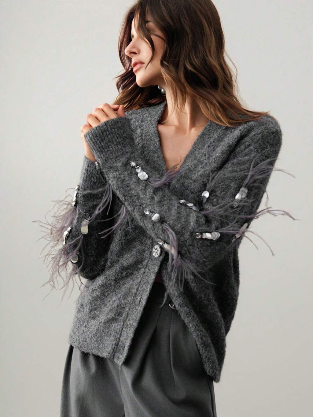 Women's Fashion Modern Christmas Floral Gray Sequin Rhinestone Feather Decor Pullover Sweater For Work, Autumn