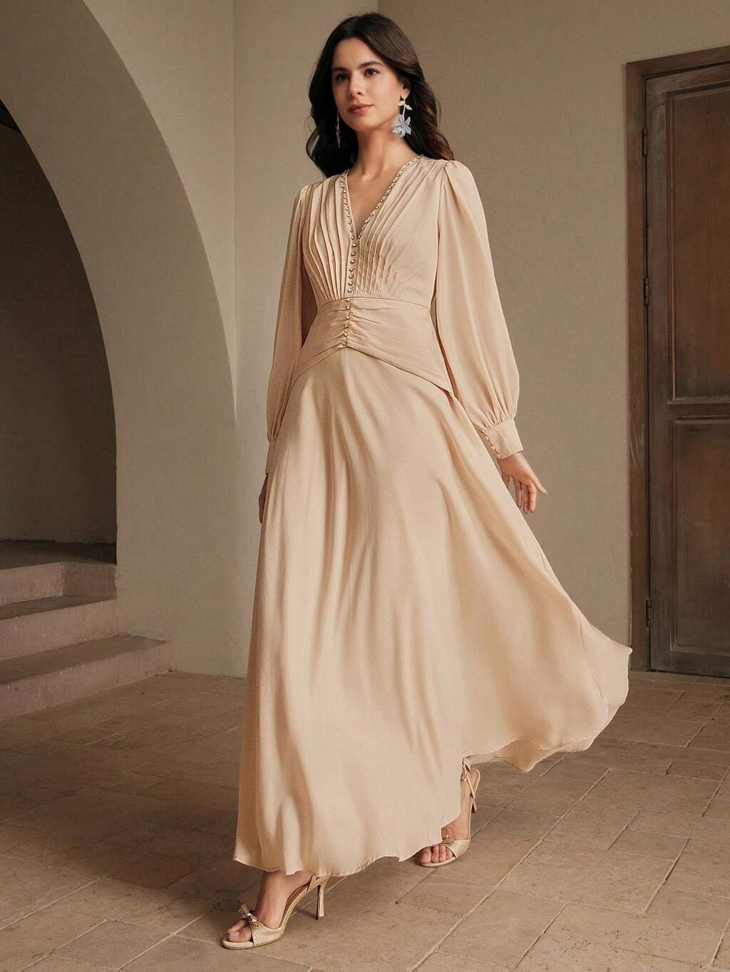 Women's Solid Color Pleated Collar Elegant Waist Cinched Long Party Dress