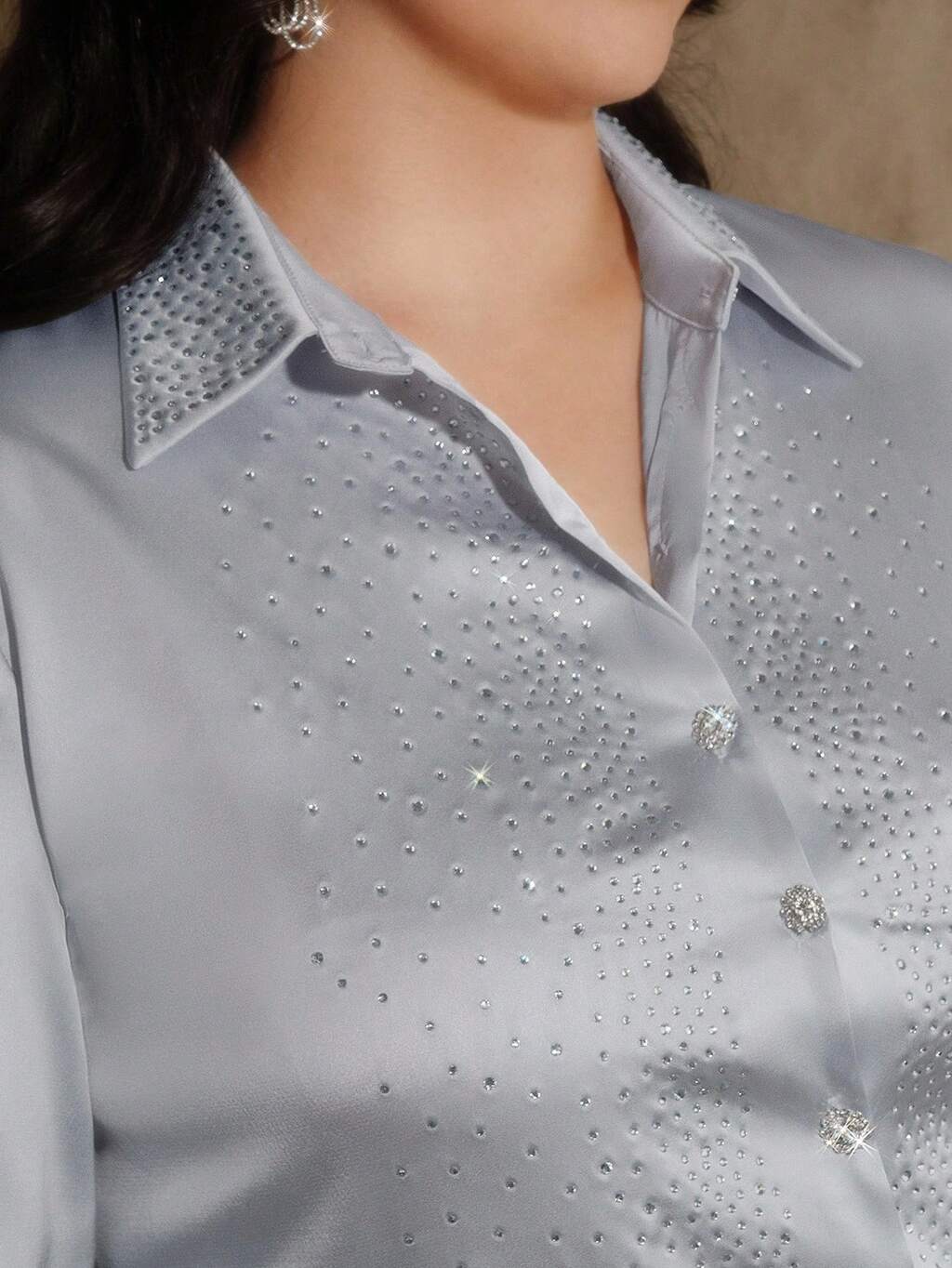 Plus Size Women's Solid Color Rhinestone Embellished Collar Commuter Shirt
