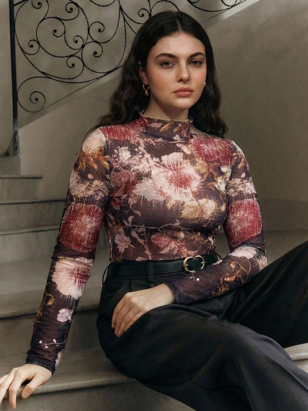 Anewsta Plus Size Women's Elegant Stand Collar Long Fitted Regular Shoulder Long Sleeve Top, Lightweight Semi-Sheer Fabric With Floral Placement Print, Subtly Showcasing Feminine Charm, Suitable For Daily Outings And Vacation Wear