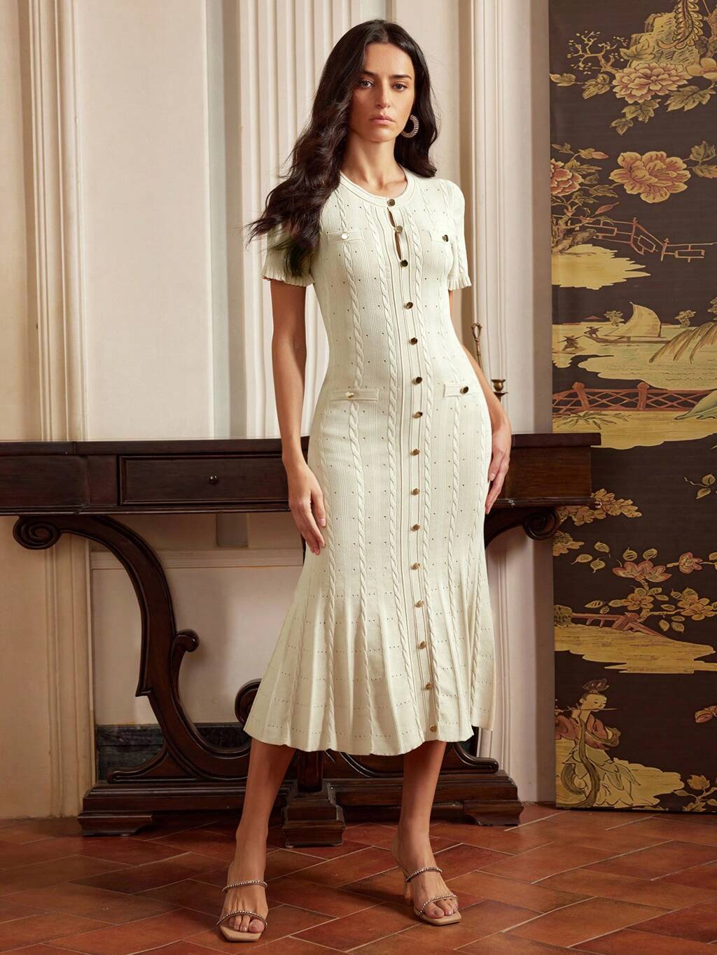 Elegant Solid Color Knitted Heavy Perforated Twist Rope Aran Cable Knit Long Sleeve Frill Trim Buttoned Pleated Fishtail Dress, Suitable For Autumn, Winter, Formal, Party, Elegant, Leisure, Work, Graduation, Wedding