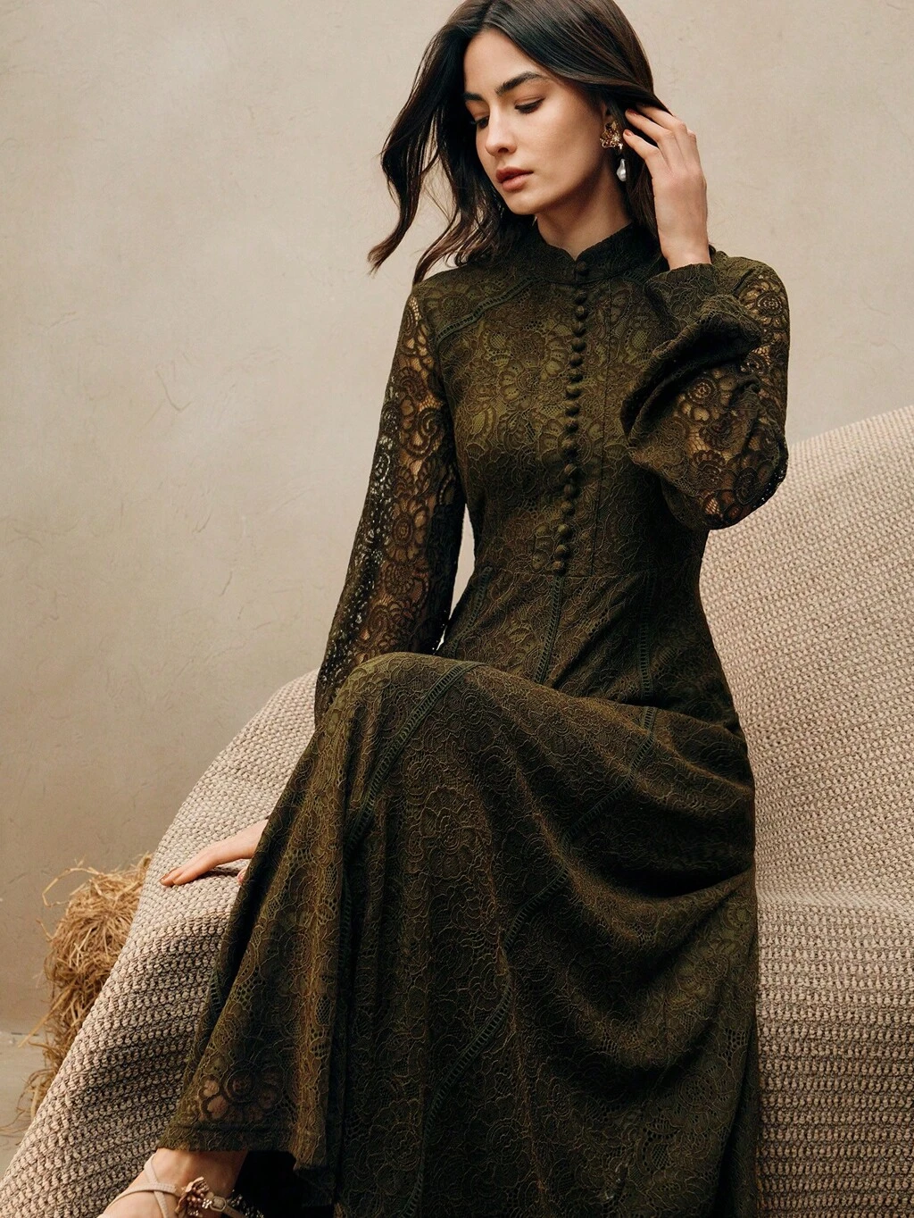 Women's Floral Lace Stand Collar Long Sleeve Elegant Spring Mini Dress