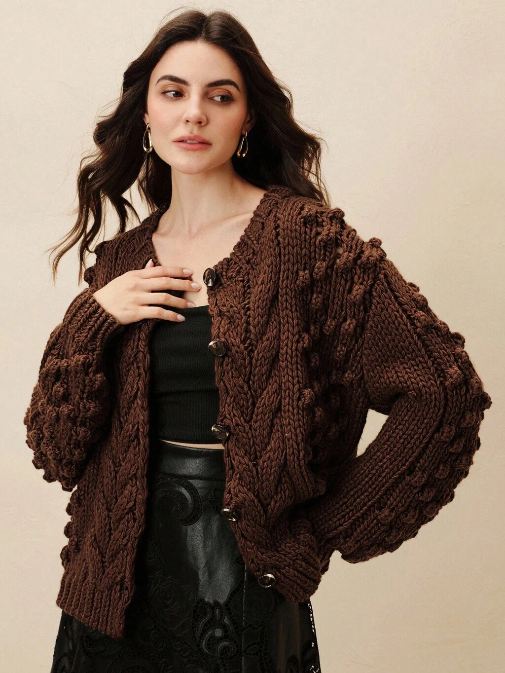 Handmade Thick Knit Cardigan Sweater For Women, Maillard Color, Chunky Yarn, Textured Bobble Design, Suitable For Autumn, Fall, Winter, Going Out, Elegant, Formal, Party, Chic, New Year, Christmas, Work, Graduation, Wedding