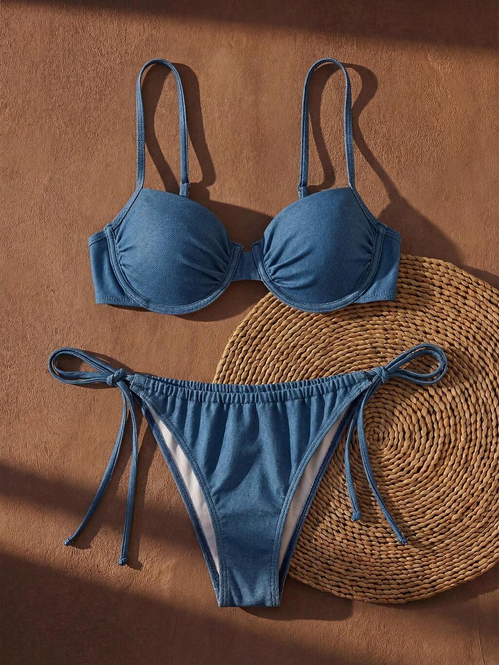 Women's Summer Beach Solid Color Fashionable Tie-Up Sexy Bikini Swimsuit Set