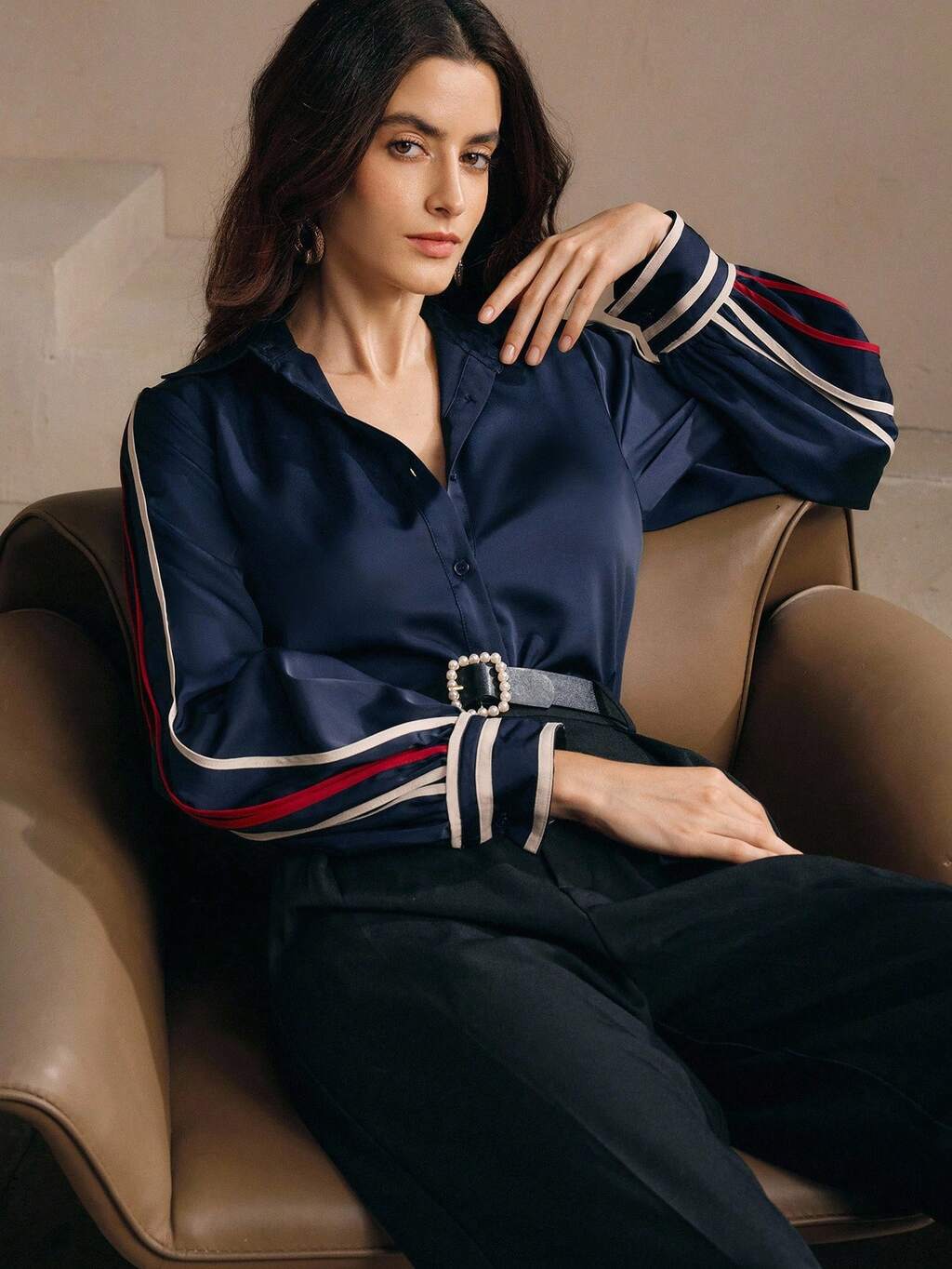 Women's Casual Commuter Loose Collar Contrast Stripe Lantern Sleeve Shirt