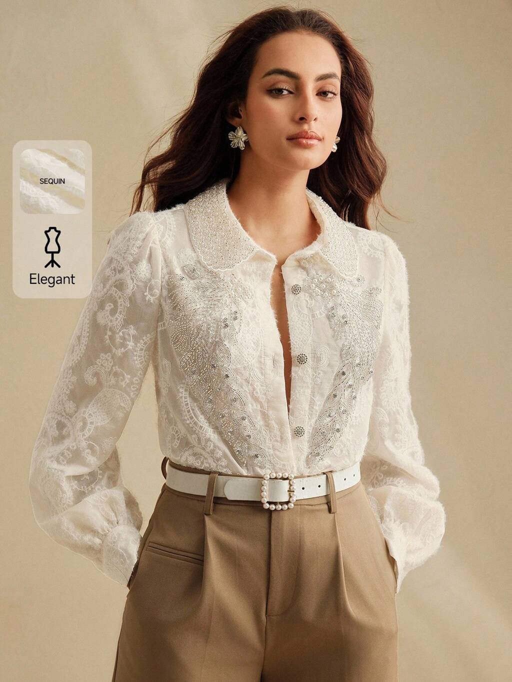 French Elegant Rose Beaded Embroidery Semi-Sheer Blouse Women Shirt