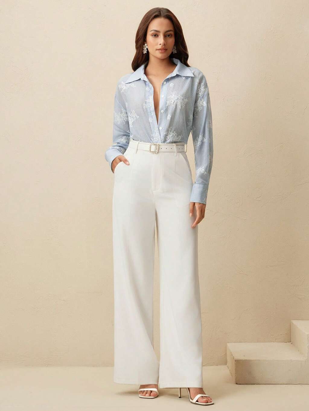 Women's Elegant Casual Loose Fit Beige Long Sleeve Shirt With Embroidered Pearl Decor, Spring