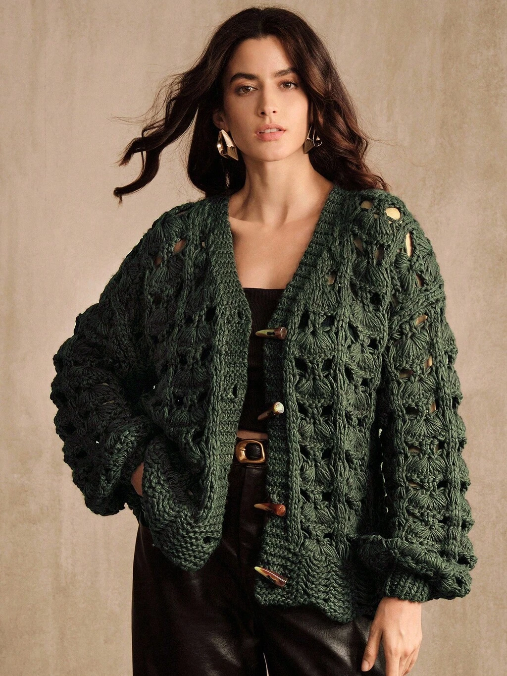3D Hollow Knit Cardigan, Iceland Yarn Woven, Horn Button Decor Sweater Jacket For Women, Christmas Pullover Sweater, Women Winter Coat, Elegant Party Dress, Fall, Winter, New Year, Elegant, Chic, Stylish, Christmas, Going Out, Winter Clothes For Women